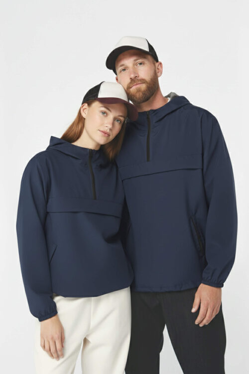 - Cuello y puños en canalé 1×1 con tira cubrecosturas interior a tono
